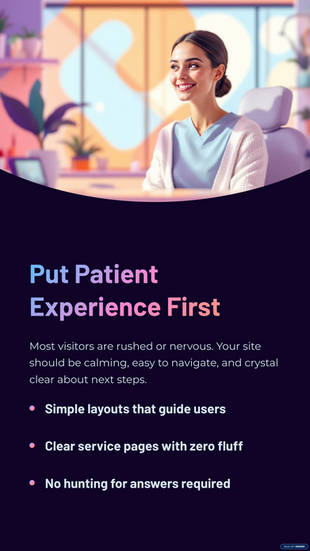Most people visiting a dentist’s website are either in a rush, a bit nervous, or both. Your site should be calming, easy to navigate, and super clear about what to do next.